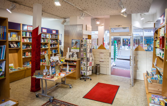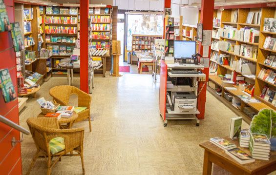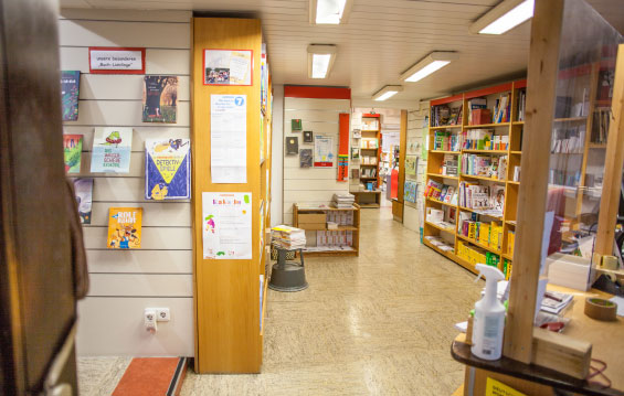 Der Verbindungsbereich zu der Ladenfläche Richtung Winkelgässchen hat eine Größe von ca. 20 m². Auf der Abbildung verdecken die rechtsseitigen Bücherregale eine Fensterfront, die den Blick in den Innenhof freigibt.